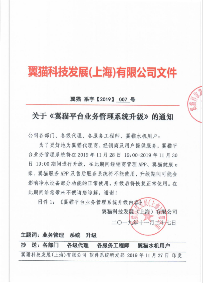 关于《翼猫平台业务管理系统升级》的通知