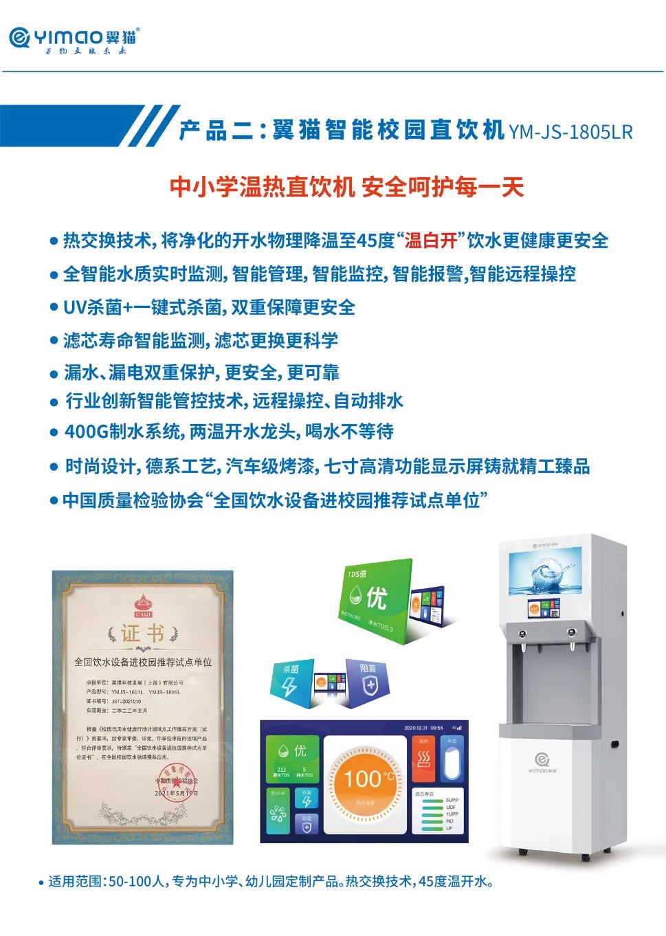翼猫科技始终专注于净饮水技术创新和自主研发。翼猫RO反渗透智能净水系统,在物联网远程控制技术支持下可以实现,实时监控、实时检测、实时控制、实时上传,当您在使用过程中,出水水质达不到饮用安全值,水机安全系统启动,会自动切断水源,保证您和家人喝上安全好水,守护您和家人健康!冷、热水双出水,选择你想要的温度。翼猫智能公共直饮机,八大优势打破传统公共净水弊端: