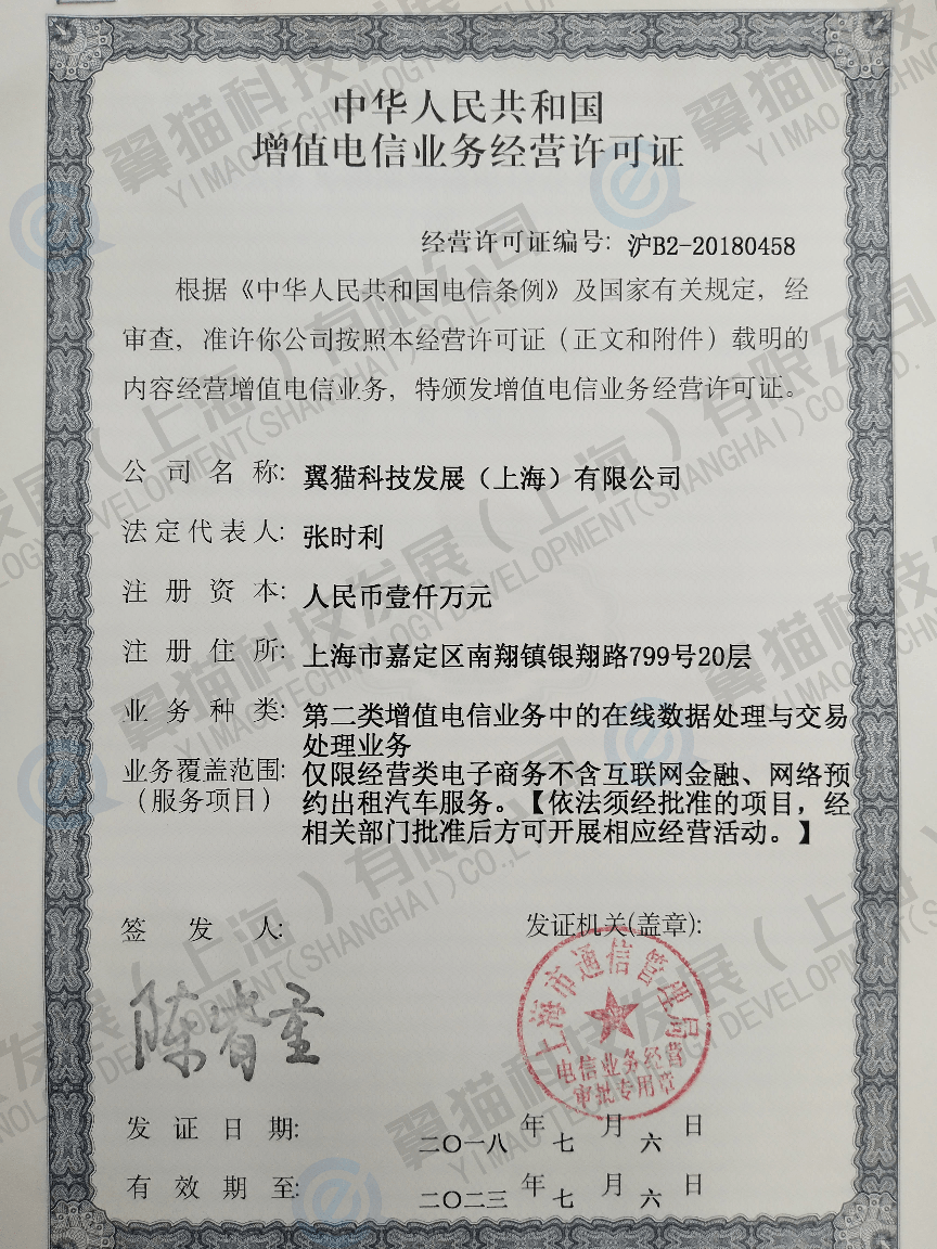 翼猫科技发展(上海)有限公司于2018年7月6日取得上海市通信管理局核发的《中华人民共和国增值电信业务经营许可证》,业务类型为“第二类增值电信业务中的在线数据处理与交易处理业务”,简称EDI证书。